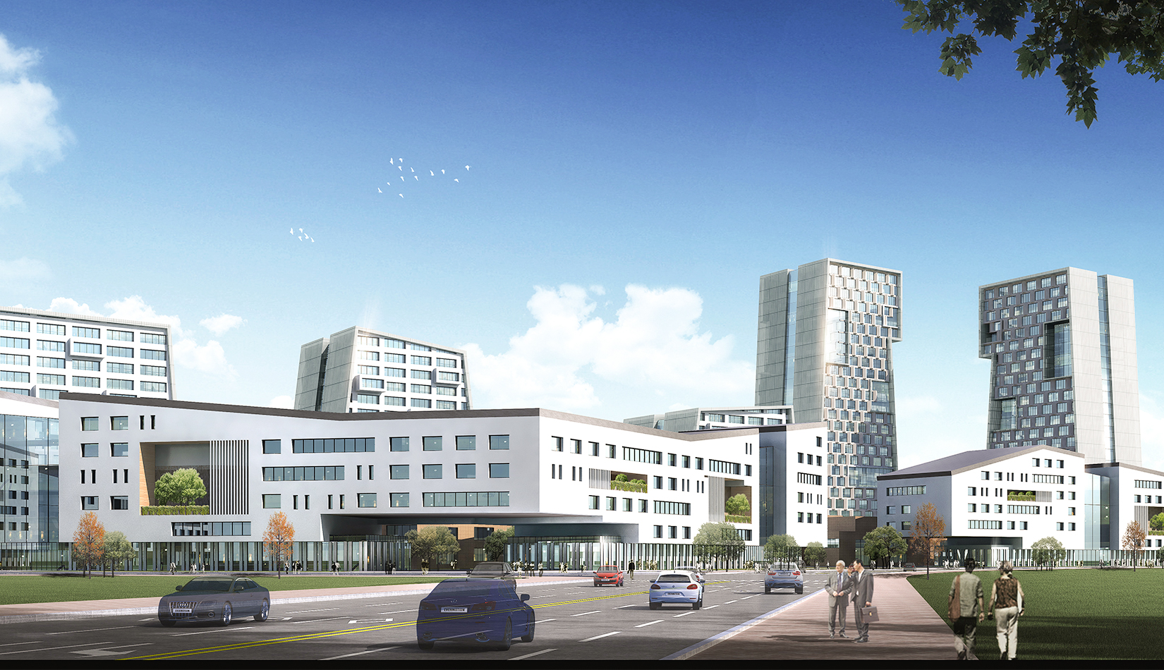 為了打造一個(gè)完美的城市沿街形象,以及營造一個(gè)安靜舒適的工作與休閑空間,我們采用了半圍合的規(guī)劃布局,北側(cè)高層建筑基本成“一”字布局,高低錯落,塑造完美的城市天際線,宛如一條盤旋上升的巨龍;在南側(cè)一個(gè)個(gè)長方形建筑成折線型連續(xù)排列,隔離周邊嘈雜的城市環(huán)境,猶如越出水面的“金鱗”,中央景觀帶東西側(cè)以友好的姿態(tài)向城市開放,美化城市形象。\
