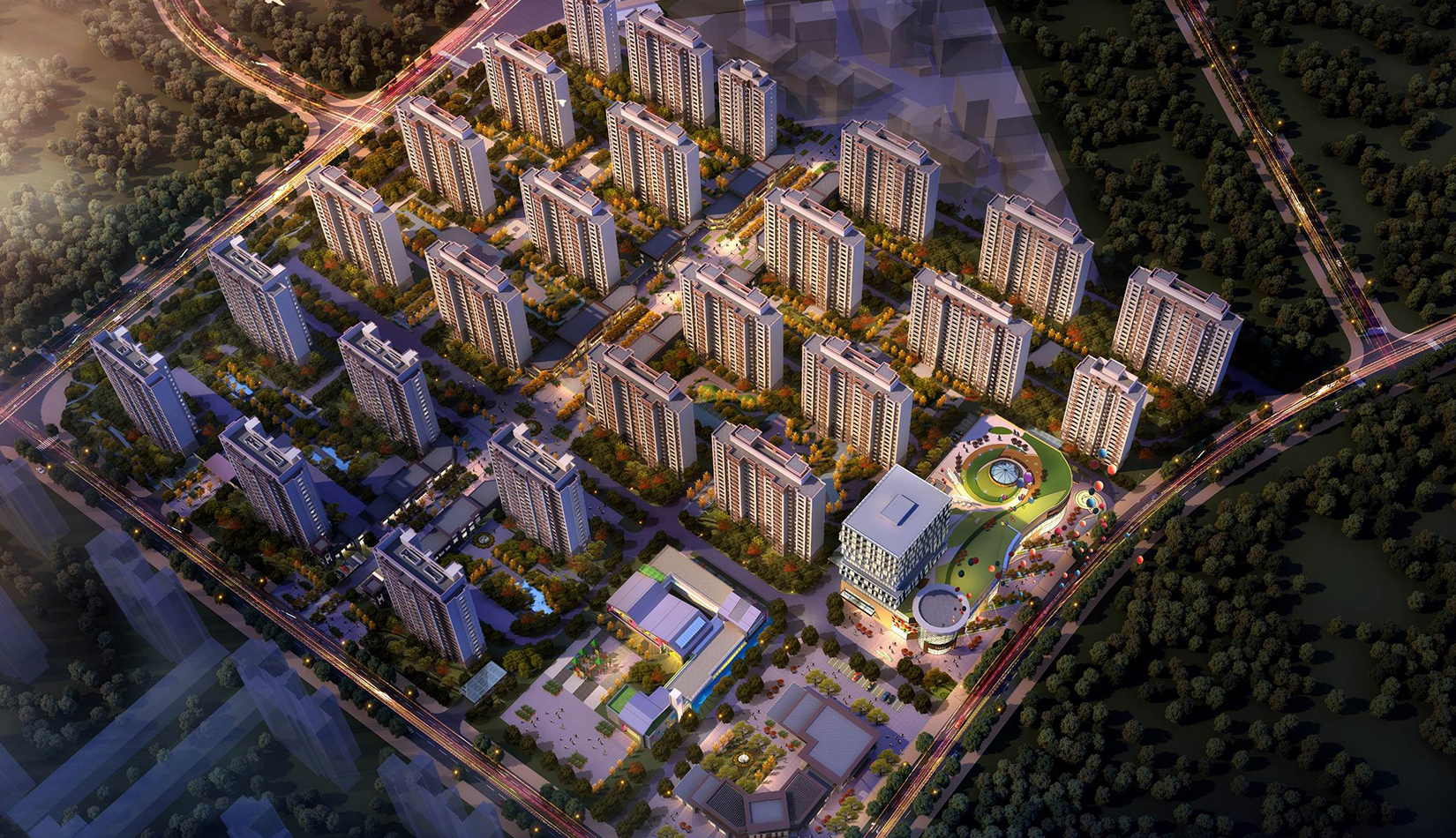 總體規(guī)劃采用街區(qū)制組團劃分,以“窄馬路、密路網”為設計向導,引入三條城市道路。合理劃分七個功能組團,營造宜人的居住尺度。遵循安置社區(qū)資源均好性原則,使用行列式建筑布局,符合相關日照規(guī)范。充分利用“金角銀邊”商業(yè)定理,采用集中布局與沿街布局兩種商業(yè)布局,注入更多商業(yè)街區(qū)活力。