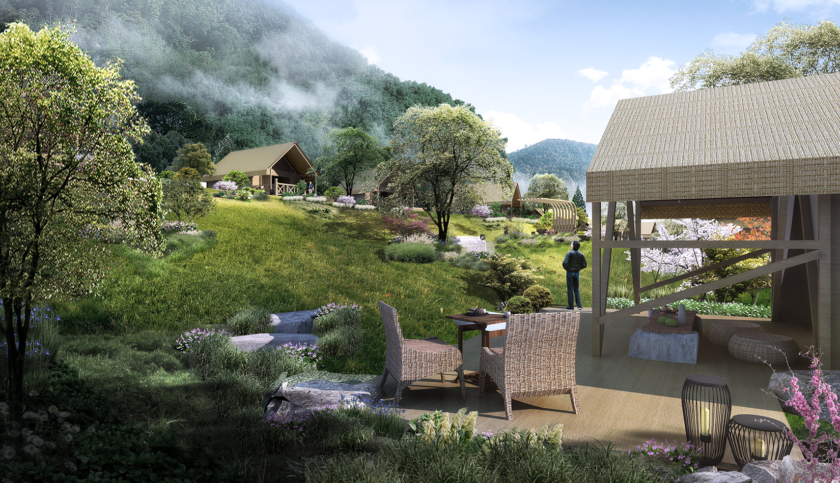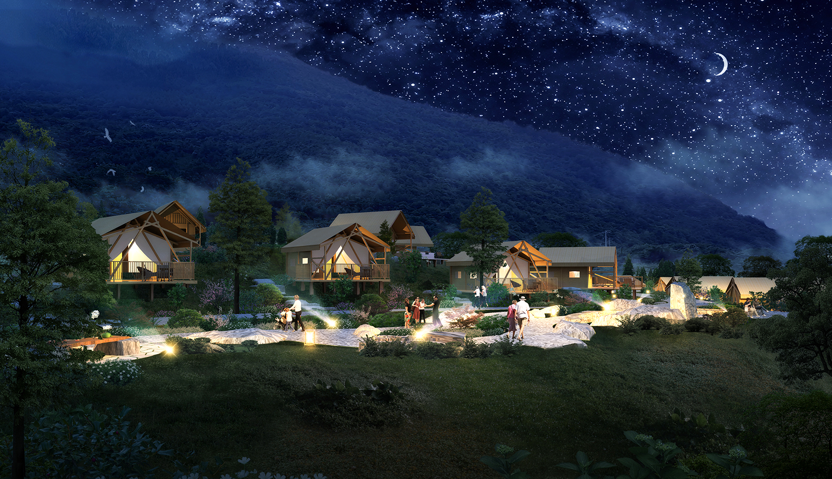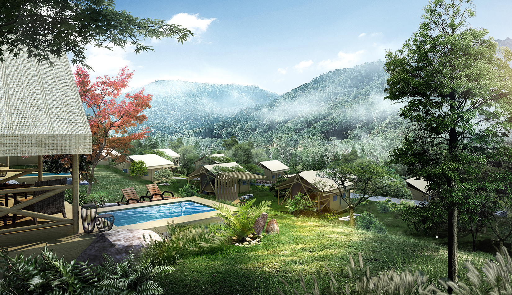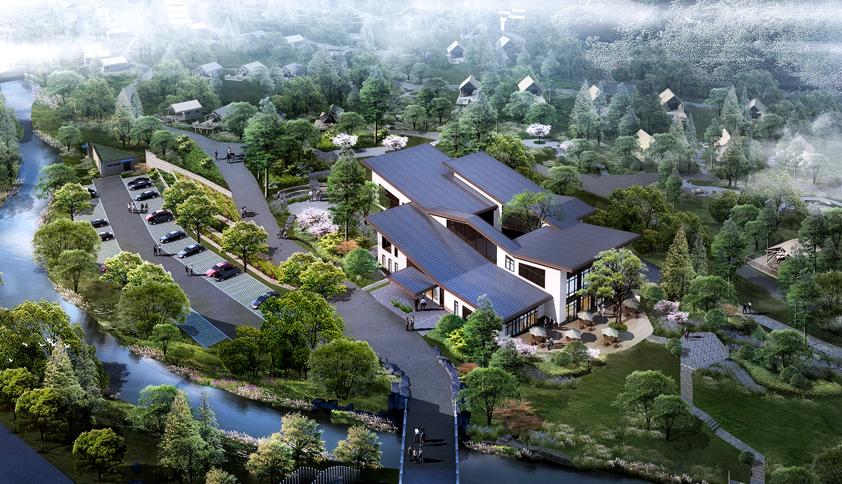 景觀設計從野奢度假酒店的“野”和“奢”兩字入手,融入荒野生態(tài)的設計理念,又要與場地相融合、與原生態(tài)相映、與當?shù)氐拿袼罪L情相交匯,突出當?shù)氐奈幕黝},強調(diào)高品質的自然、野奢度假,從而打造出一個具備個性與特色,使游客能夠享受到自然野趣體驗的景觀環(huán)境。