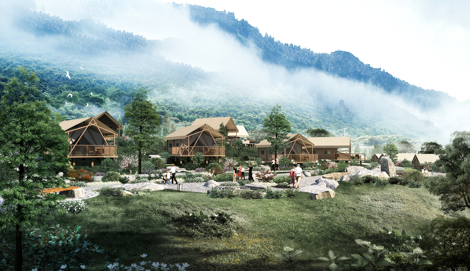 根據(jù)基地的地勢分布及功能需求,空間結構上分為“一帶兩軸三核心五組團”。建筑設計的五個組團,分別是濱水休閑組團、水畔風光帳篷組團、高端養(yǎng)心帳篷組團、中心服務組團及山居野趣帳篷組團??头坎糠植捎脦づ穸燃傥莸姆绞?,凸顯野奢度假的浪漫形式。