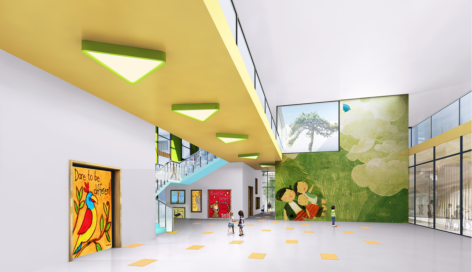 建筑造型來源于兒童最初對房子的印象并進(jìn)行延伸,加上積木搭接形態(tài),形成C字形圍合的主體建筑,就像父母溫暖的懷抱;建筑造型跟兒童產(chǎn)生很好的親切感,讓兒童將上幼兒園成為快樂的事情。同時(shí)形態(tài)結(jié)合地緣文化特色,采用雙折坡屋頂,寓意展翅翱翔的海鷗。