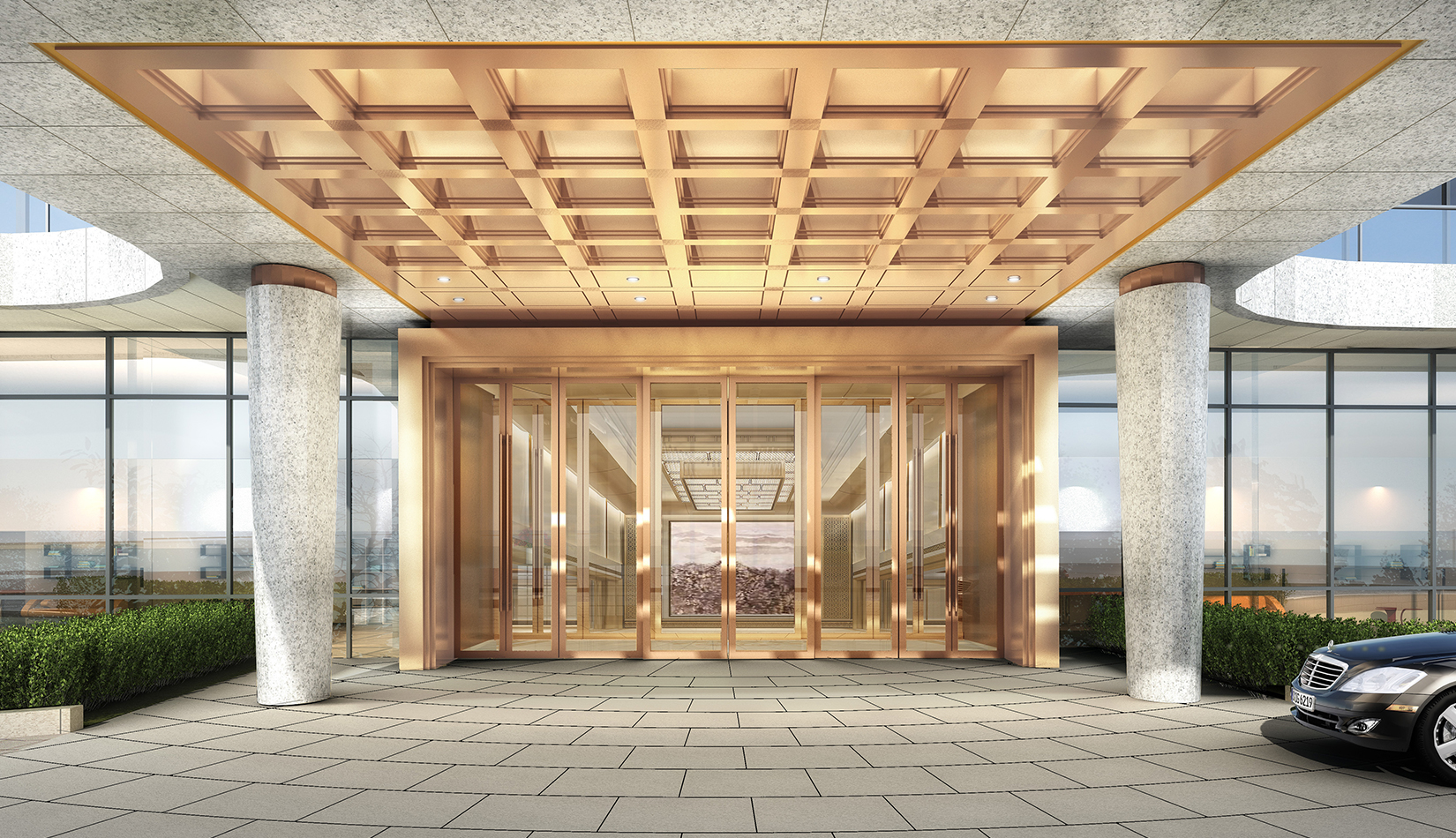 一層走廊---走廊為大廳一部分延續(xù)迎賓大廳的設(shè)計風(fēng)格,天花跌級有序,方圓向上,內(nèi)嵌如意紋理淺雕銅板, 增加厚重、文化與層次,墻面挺拔向上轉(zhuǎn)折有序,頭尾嵌入水紋樣式銅板雕刻,增加儀式感與莊重性,同時提升文化附加,簡練現(xiàn)代、精致細節(jié),突顯別致有序、莊重典雅。