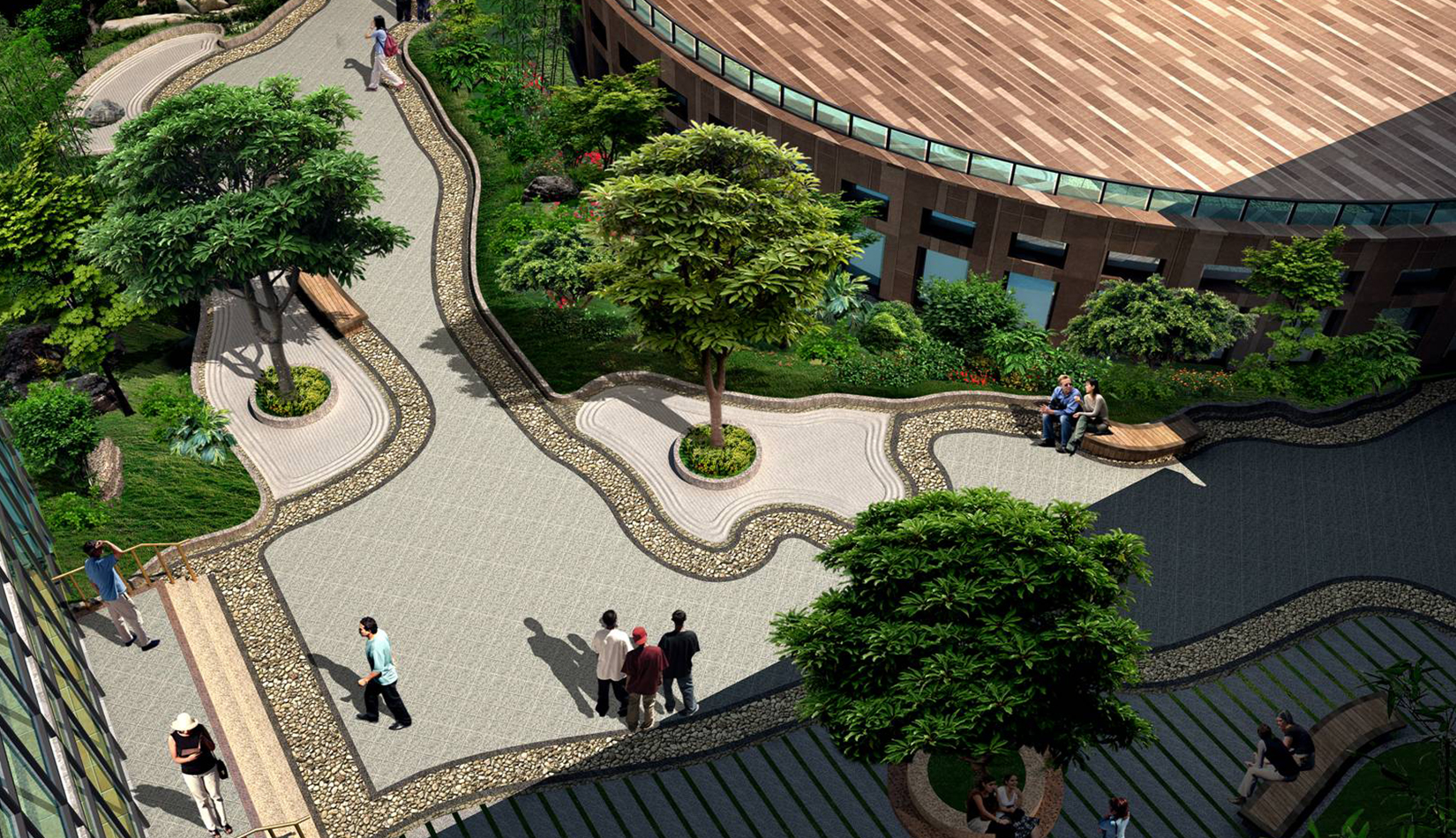 1. 將抽象化的鳳翎設(shè)計成特色種植,結(jié)合建筑形態(tài)配以流線型鋪裝設(shè)計,在鋪裝上增加鳳凰島中學校訓校風的細節(jié)設(shè)計,凸顯學校濃郁的文化氛圍以及室外景觀環(huán)境的精致。