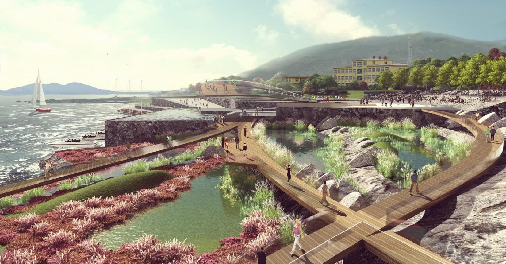 該項目以露天海洋科技博物館為設(shè)計理念,打造一個集生態(tài)保育、展示教育、科學(xué)科普、交流傳播、旅游觀光等功能于一體的國家級愛國主義教育基地。設(shè)計是以地域性、生態(tài)性、智慧性為指導(dǎo)原則,將整個海岸帶劃分為五個分區(qū)進行設(shè)計,包含了科研、文教、生活三個方面,重塑海洋價值觀,打造一個海洋科技交流平臺。